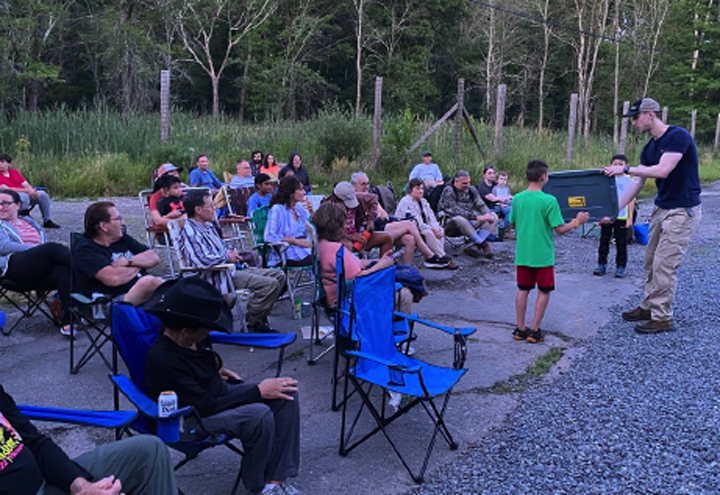 As dusk approaches, Rutgers researcher Evan Drake conducts an interactive “echolocation” demonstration with the audience. Photo credit: Parsippany Bat Protection Project