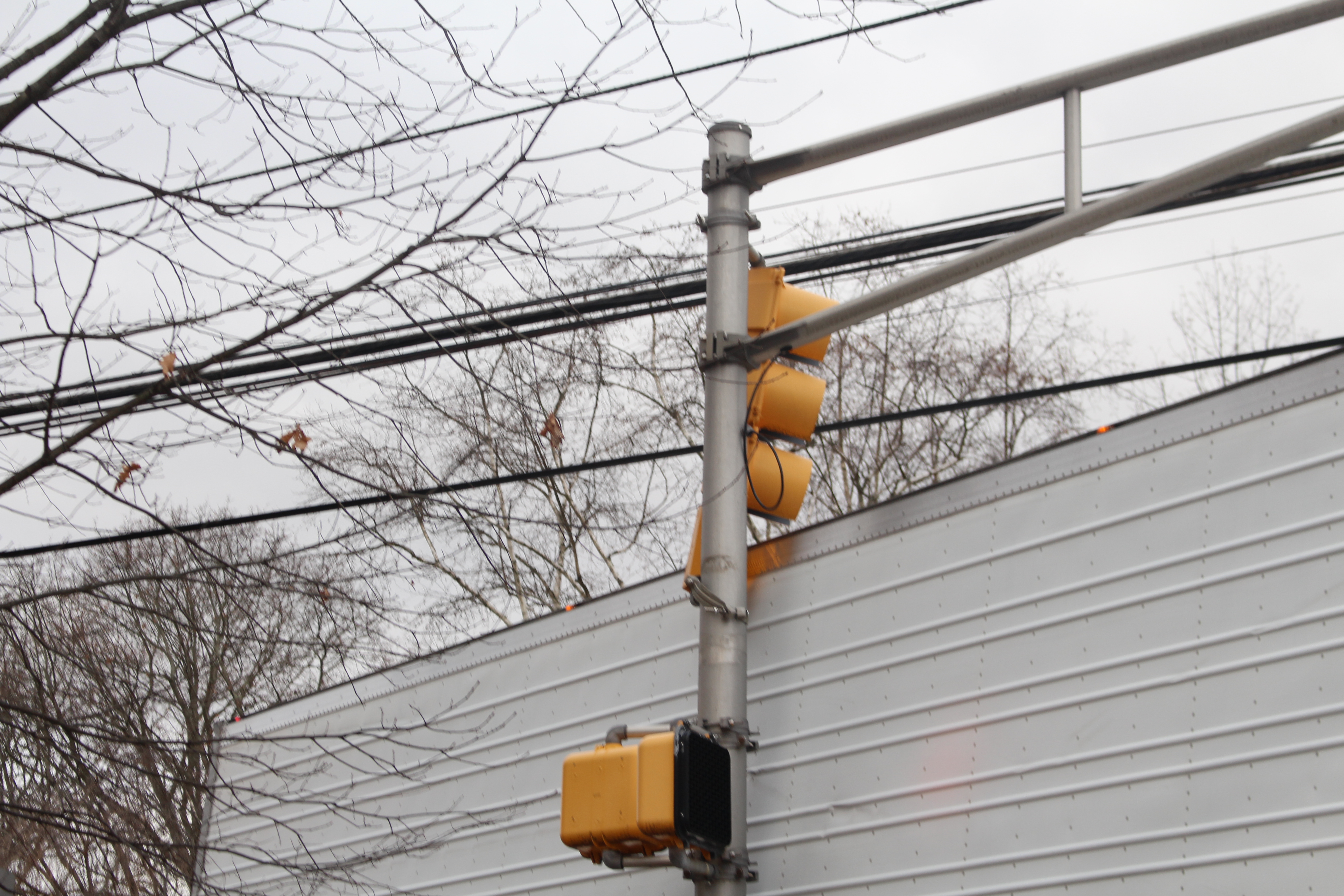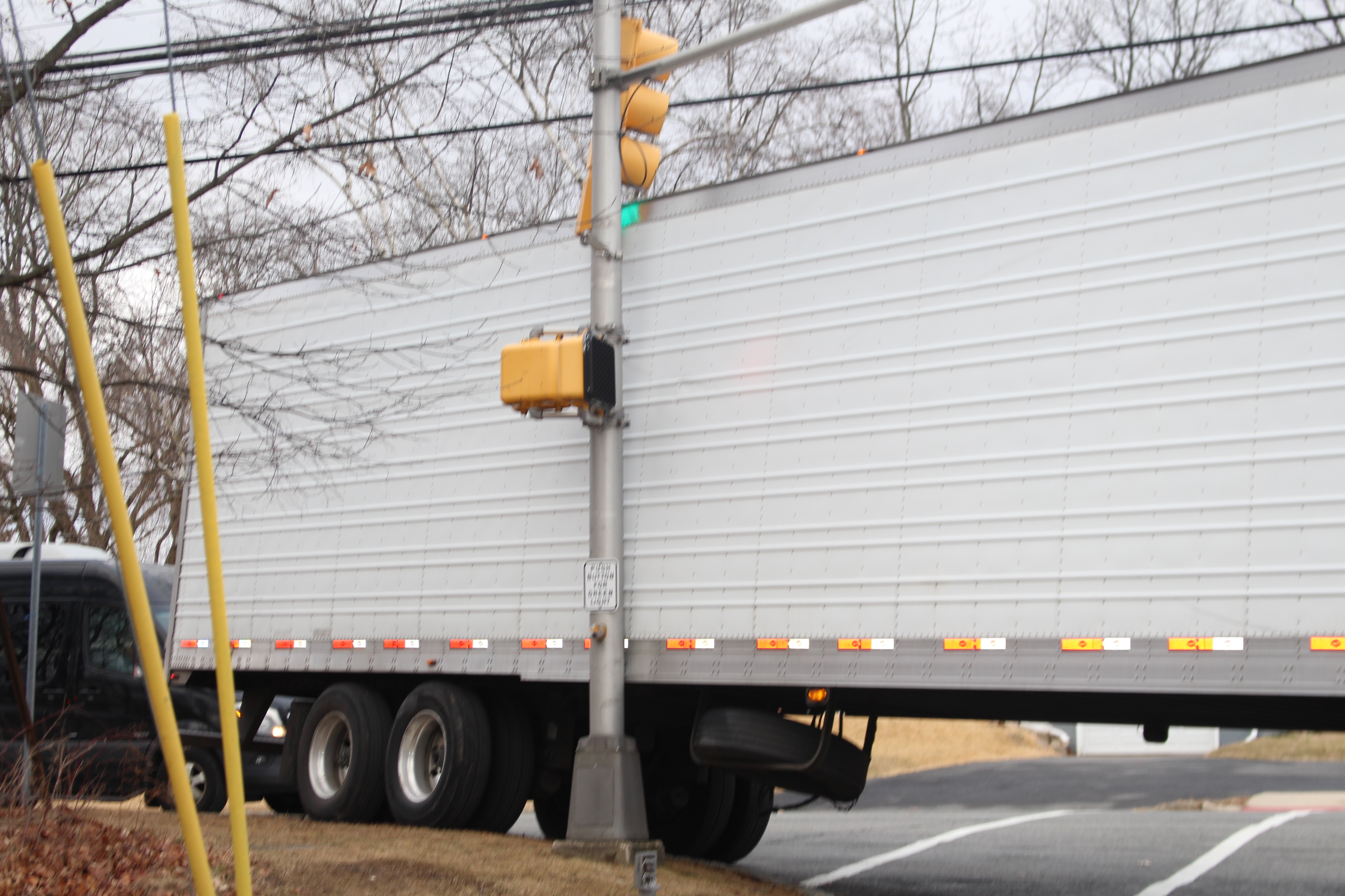 Michael Brown, 27, Sanford, Florida was attempting to turn right on Halsey Road from Littleton Road when his tractor trailer got stuck against a traffic signal, causing the trailer to become stuck at the intersection. A heavy duty tow truck from Powder Mill Towing arrived on the scene and was able to pull the vehicle off the curb.