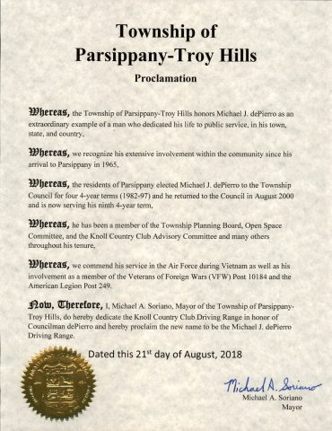 PARSIPPANYย โ€” At the council meeting of Tuesday, August 21, Mayor Michael Soriano presented longtime Councilman Michael dePierro with a proclamationย making it official by dedicating the Michael dePierroย Driving Range at the Knoll Country Club. On Saturday, August 25 the official dedication took place.