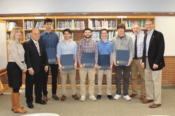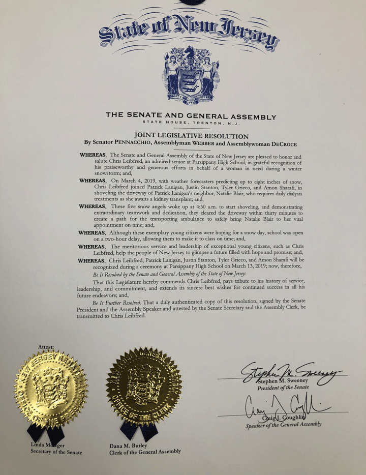 PARSIPPANY โ Senator Joe Pennacchio, Assemblyman Jay Webber, and Assemblywoman BettyLou DeCroce (all R-26) visited Parsippany High School on Wednesday, March 13 to thank the five senior boys who shoveled their neighborโs driveway after a snowstorm, ensuring she could be safely transported to dialysis amid the weather.