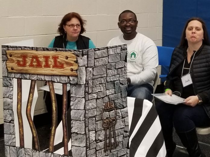 Morris County Sheriff’s Officers played roles too at the simulation, escorting people away from stations to “jail” in a back corner of the room for infractions that included failure to pay a probation fine or speaking disrespectfully to a judge.  By the time role players had reached the fourth week of trying to meet obligations, most were in jail – a reflection, Reeves said, of how easily a former inmate can return to jail without assistance.