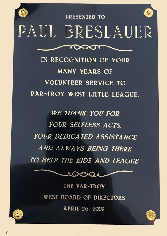 The plaque read “In recognition of your many years of volunteer service to Par-Troy West Little League. We Thank you for your selfless acts. Your dedicated assistance and always being there to help the kids and the league.”