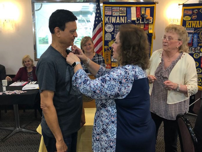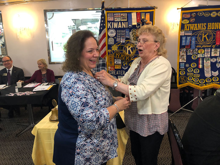 Kiwanis Club of Greater Parsippany Secretary pins a “past treasurer” pin on outgoing Treasurer Connie Keller