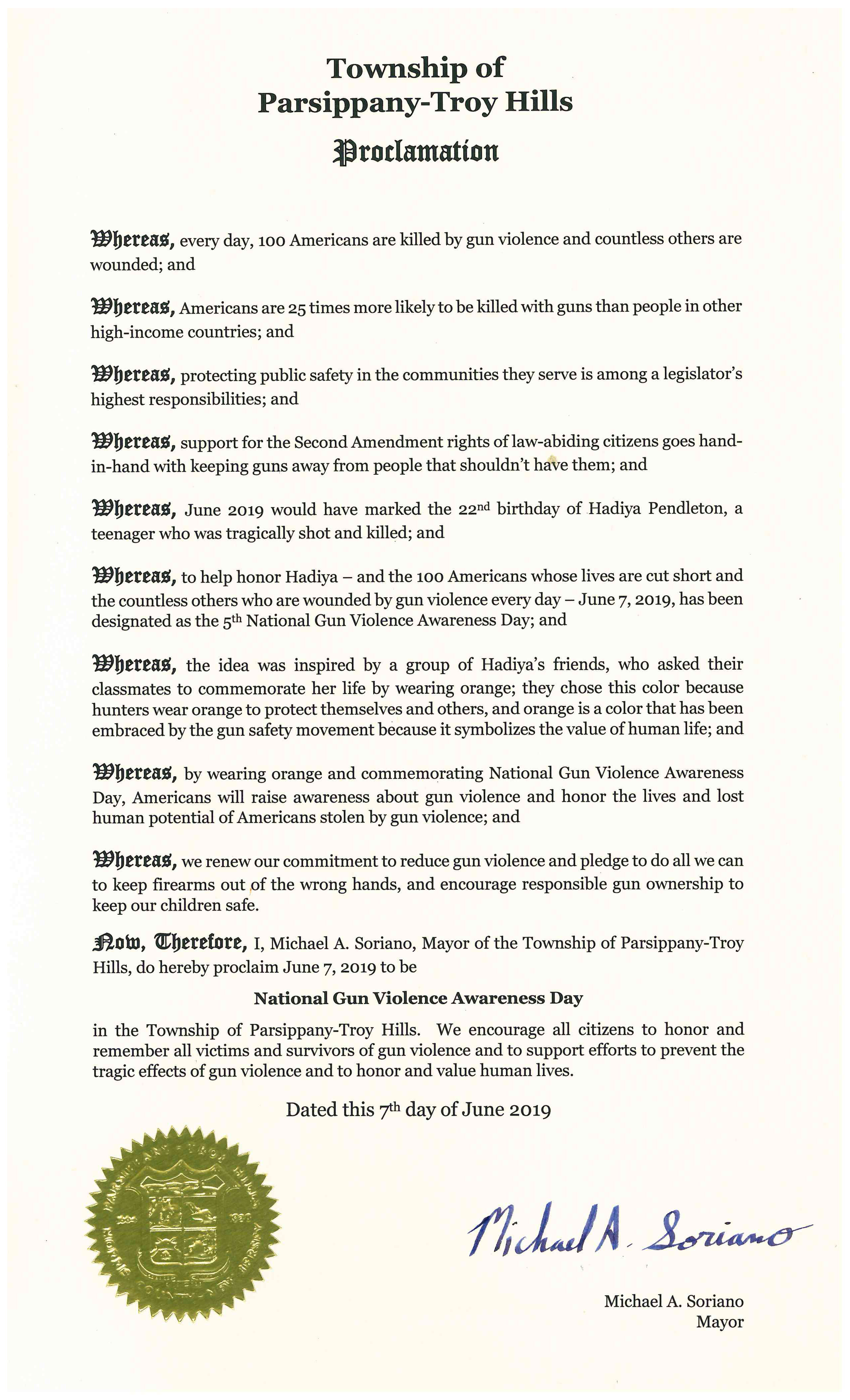 PARSIPPANY — Michael A. Soriano, Mayor of the Township of Parsippany-Troy Hills, presented to “Moms Demand Action” proclaiming June 7, 2019 to be National Gun Violence Awareness Day in the Township of Parsippany-Troy Hills.