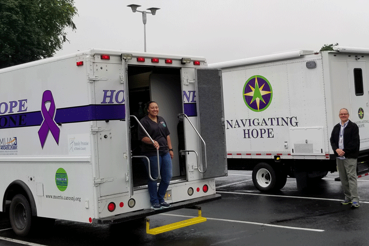 Navigating Hope, a Morris County-run outreach vehicle like Hope One that brings social services guidance and referrals directly to individuals, worked alongside the Hope One staff to answer any questions posed by passersby and patrons leaving Rite Aid with their free Naloxone, which is known by the brand name Narcan.