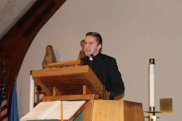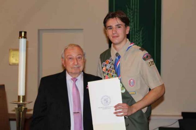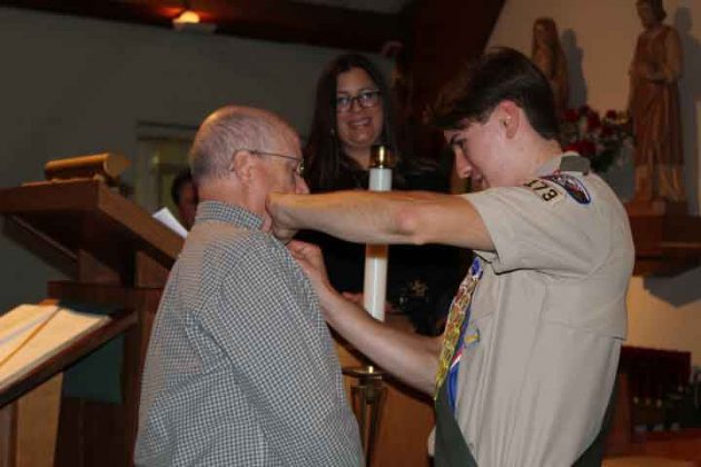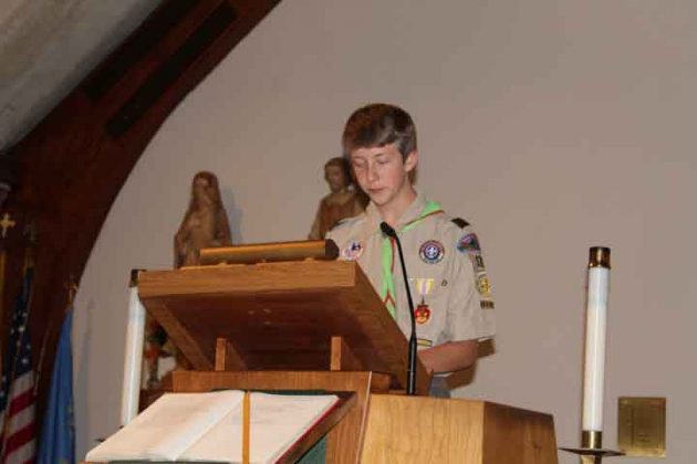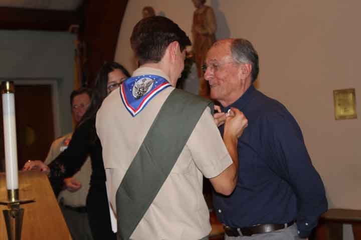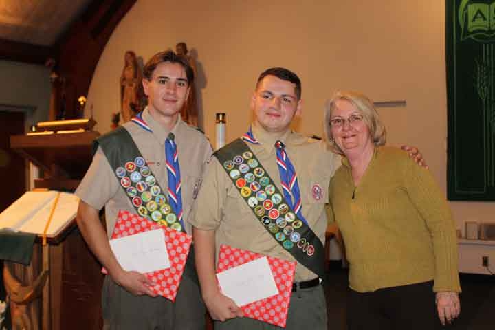 Advancement Chair Chris Modin read the certification of the Eagle candidate. Eagle Badge Presentation was presented by Daniel V. Metcalf (for Timothy Metcalf) and Christine Aguesseau (for Colin Aguesseau). Eagle Charge was read by Past Scoutmaster John Worthington and the Benediction was by Father Michal A. Falgowski from Saint Christopher R.C. Church.