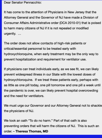 Today, in a letter to Pennacchio, New Jersey physician Dr. Theresa Thomas echoed the senator’s position.