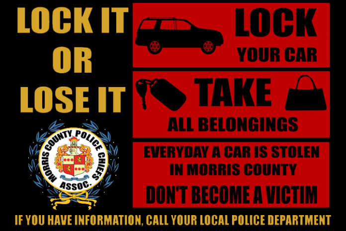 MORRIS COUNTY — Morris County Prosecutor Fredric M. Knapp, Acting Chief of Investigations Christoph Kimker, and President of the Morris County Police Chiefs’ Association remind residents to always lock their vehicles at night, even if parked in the driveway. Never leave your key fobs in your vehicle.