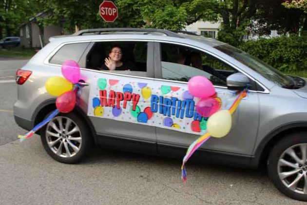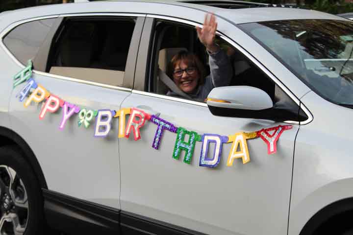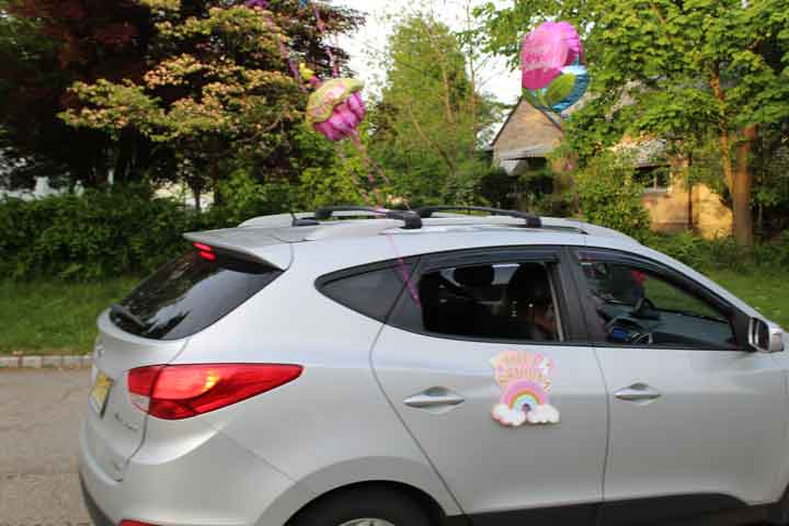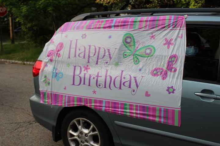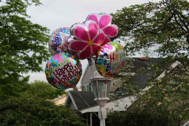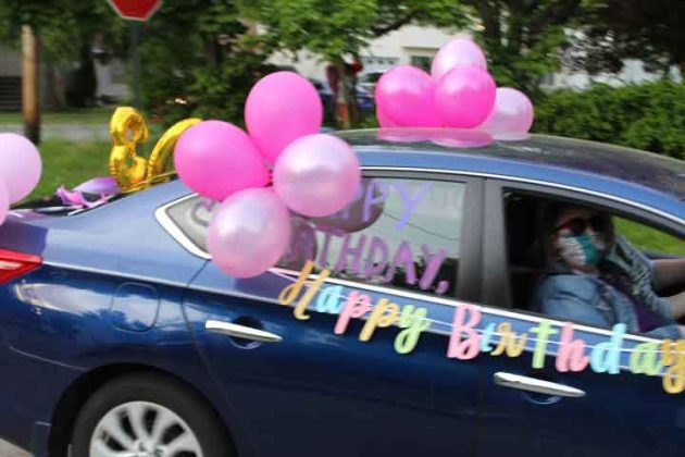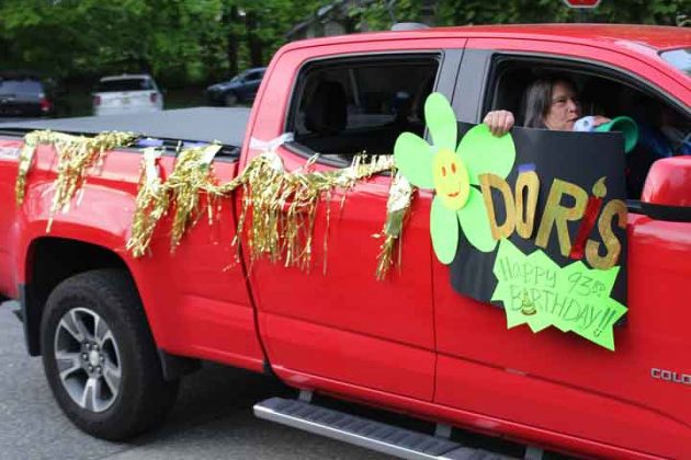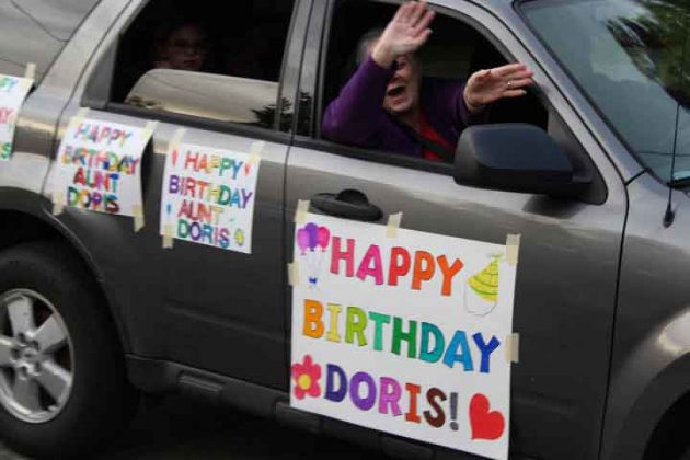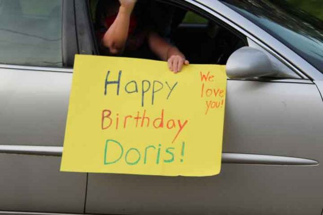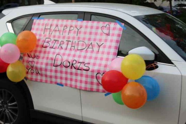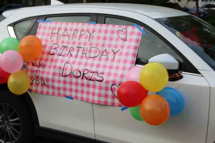 Flowers, balloons, strings dangled from the vehicle’s windows as well as signs that said happy birthday Doris.