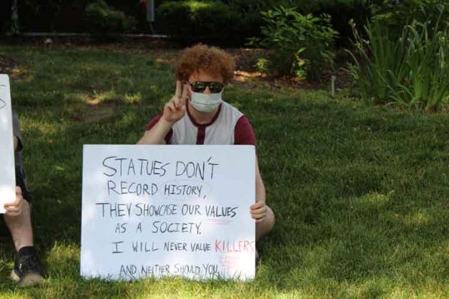 It was a peaceful demonstration as anticipated. About 30 demonstrators attended and listened to about a half dozen as they read their narratives as to why the statue should be removed. The organizers maintained their dignity throughout.
