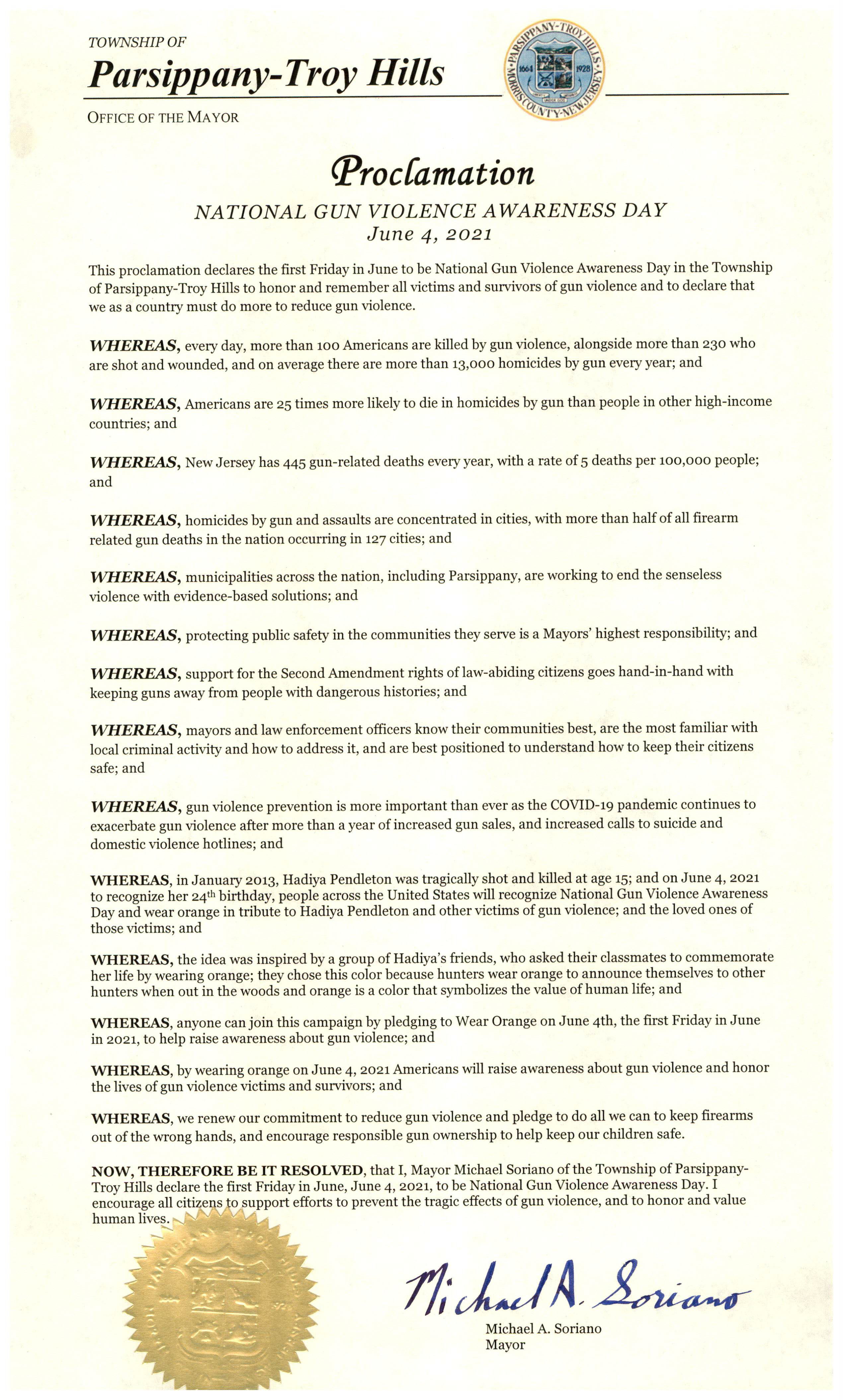 PARSIPPANY โ€” Mayor Soriano Issues Proclamation for National Gun Violence Awareness.