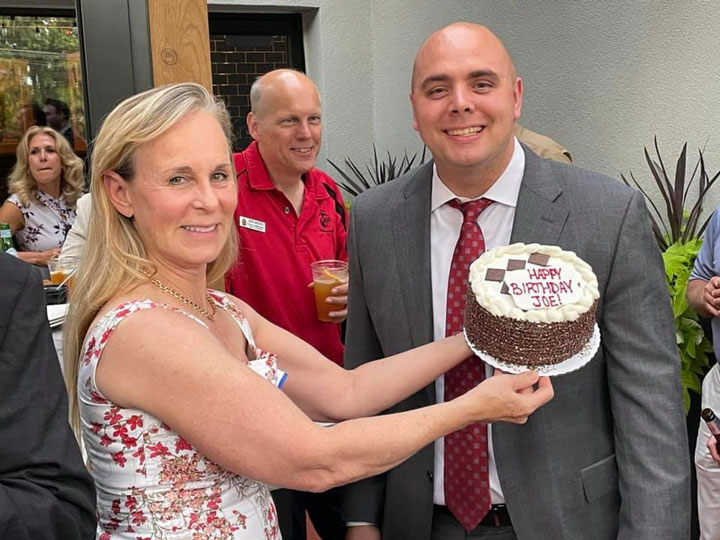Mendham Boro Mayor Christine Glassner presents Boonton Council member Joseph Bock with a Birthday cake during the fundraiser