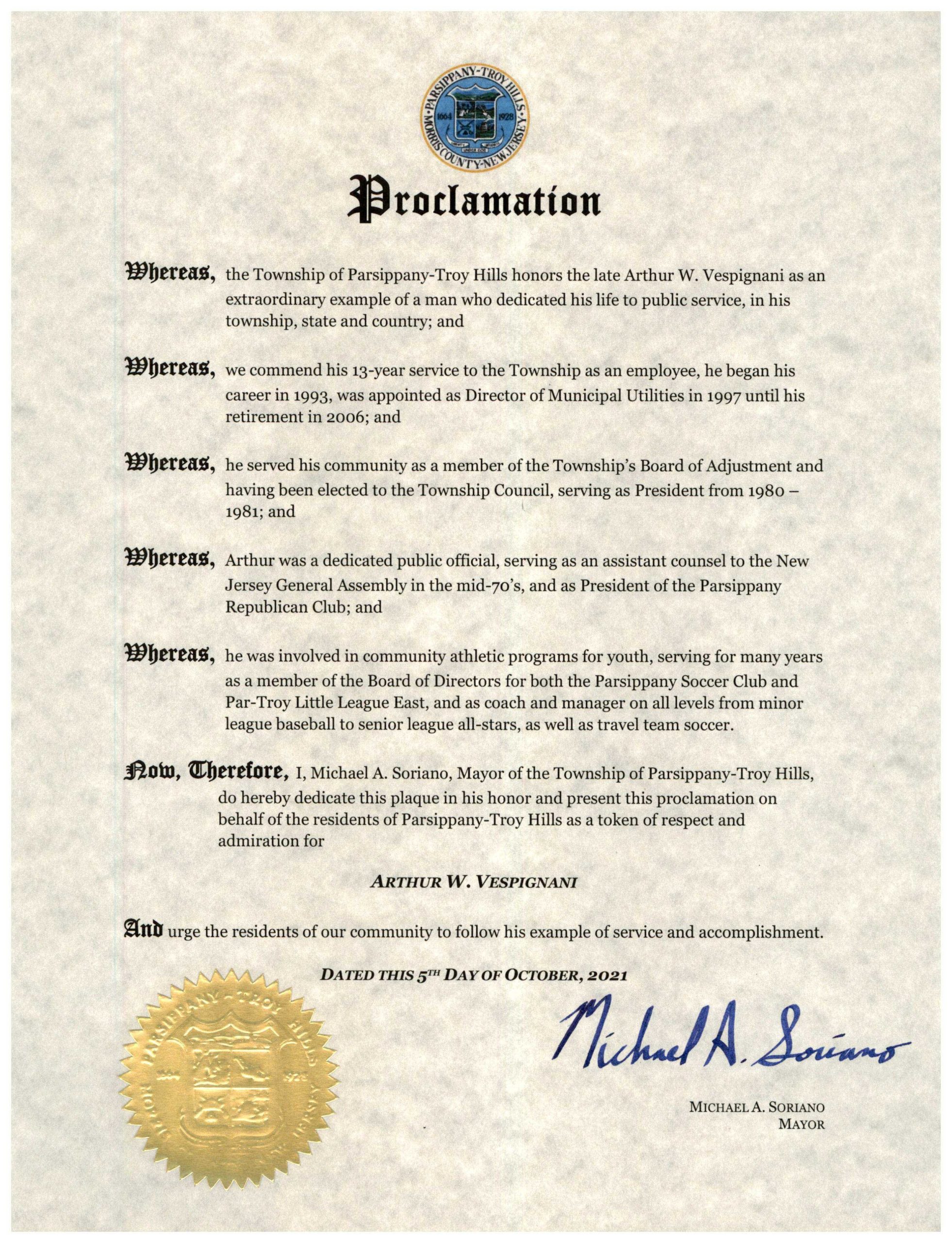 PARSIPPANY โ Parsippany-Troy Hills Mayor Michael Soriano presented a proclamation to the family of the late Arthur W. Vespignani on Tuesday, October 5 at a council meeting.