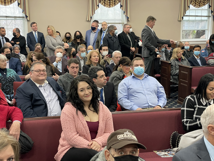 Councilman Justin Musella was sworn-in first.ย He was accompanied by his fiancรฉ Courtney Pirone who held the Bible.ย Senator Joe Pennacchio had the honor of administering his oath of office.ย Musella’s large family was in the audience beaming with pride.