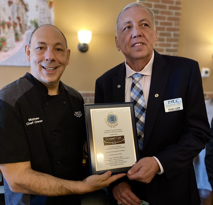 Frank Cahill, Chairman of Parsippany-Troy Hills Economic Development Committee presented Matt with a plaque congratulating his 15 years in business.