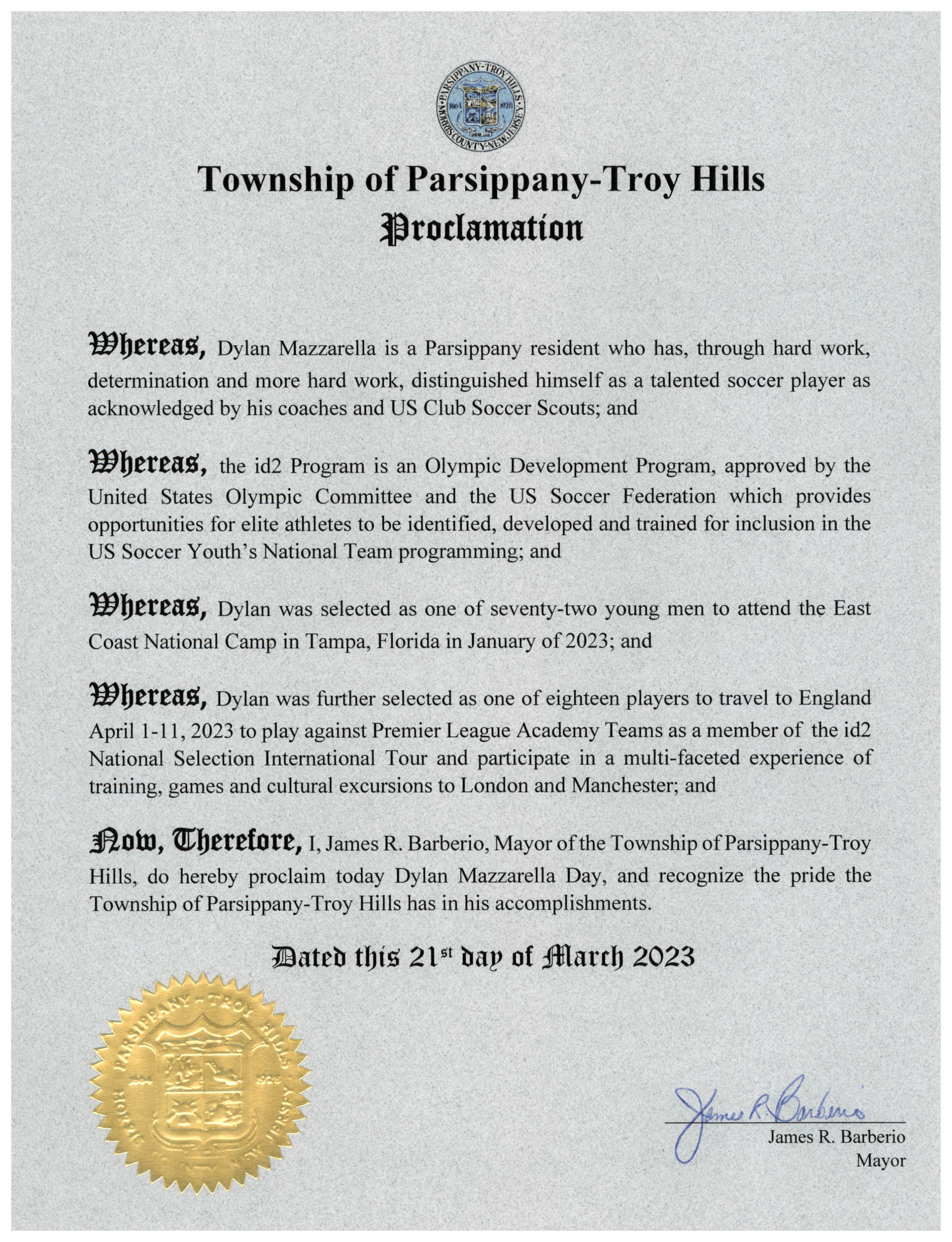 Recognizing the pride the Township of Parsippany-Troy Hills has in Dylan's accomplishments.