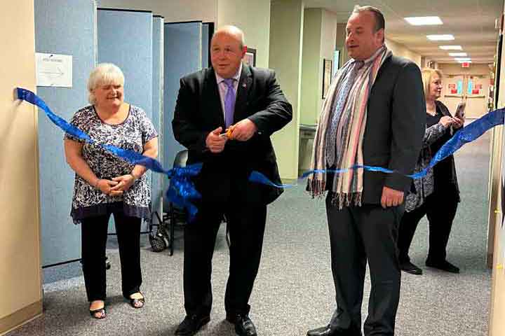 Despite being forced to sell their building, the members of Temple Beth Am were determined to preserve their identity and voted to find a new home. With the Covid-19 pandemic preventing in-person gatherings, they continued to hold services and Torah study on Zoom while searching for a new space. Eventually, they signed a lease with Adath Shalom and began constructing a beautiful new sanctuary within the Adath Shalom building. Temple Beth Am’s new home was celebrated with a ribbon-cutting ceremony, attended by 1st Vice President Pat Greenberg, Mayor James Barbeiro, and Rabbi Matthew Reimer.