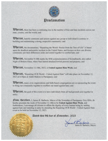 PARSIPPANY  — Parsippany-Troy Hills Mayor James Barberio has issued a proclamation designating the week of November 12-18 as United Against Hate Week. Additionally, the mayor encourages all citizens to acknowledge the worth of every individual by joining together in opposition to hate.