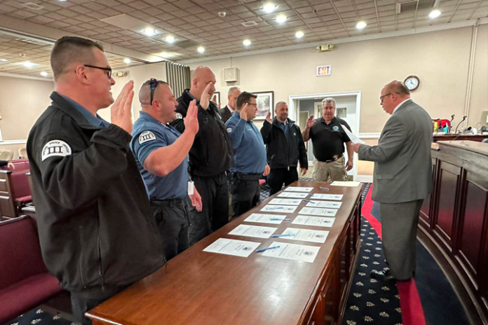 During a ceremony held on January 4, Mayor Barberio presided over the swearing-in of SLEO officers George Petersen, John Palardy, Fred Arnold, John Orrico, Daniel Cicala, Ed Lepre, and Mike Ruggier.