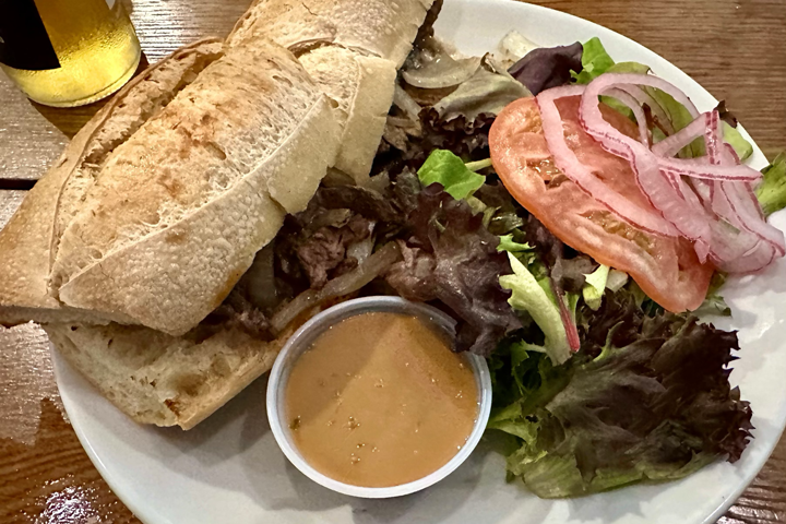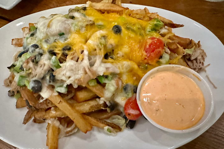 Our selections for lunch started with several shareable appetizers. The Buffalo Wings (16 wings with Celery, Carrots, and Blue Cheese) came out, and Nacho Fries (Pulled Pork, Jalapenos, Tomato, Green Onion, Black Beans, and Cheddar Cheese). They were quickly devoured, as usual, while we worked on our preferred entrées. I opted for the Thinly Hot Pastrami Sandwich. It came with Spicy Mustard and Swiss Cheese on toasted Rye bread. It was very tasty and satisfying, and it went well with my Miller Lite.