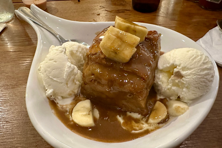 Rarely passing on dessert, I went with the Banana Bread Pudding (Topped with 3 Scoops of Ice Cream and Caramel Drizzle). Wow! Excellent! Other choices included the Chocolate Lava Cake (topped with a Scoop of Ice Cream and Cherry Sauce) and the New York Cheesecake (with Cherry Sauce): a Cappuccino to cap the whole thing off and another fantastic dining experience in the books.