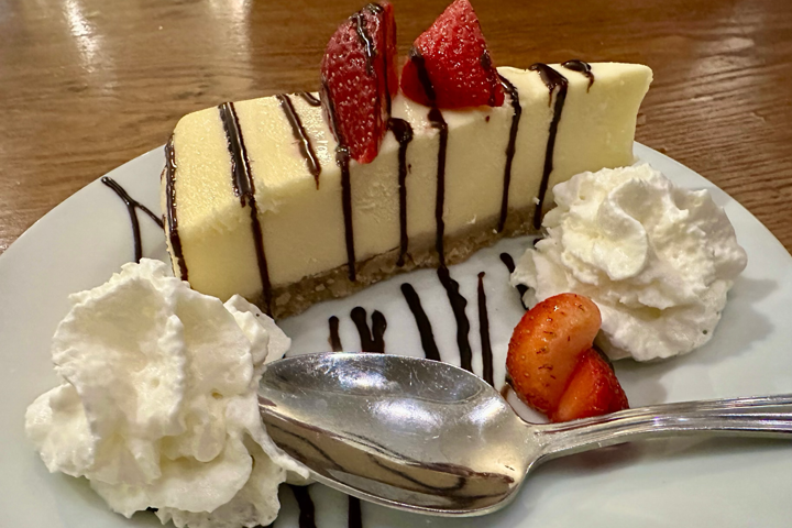 The lunch menu includes much of your usual American/Comfort Food café choices, complete with appetizers, salads, soup, burgers, sandwiches, wraps, and deli specialties. As our group often does, we ordered a square pizza to share, but sadly, the pizza was only available on the dinner menu. Yes, they have three different menus: breakfast, lunch, and dinner—all offering a tempting selection of many of your classic dishes, along with some interesting and unique options. Breakfast includes such choices as Steak and Egg Benedict, Shrimp and Grits, Huevos Rancheros, various omelets with some very cool names, griddle options such as Banana Pecan Pancakes and Chicken and Waffles, along with many more mouth-watering items that make it difficult, but fun, to decide. You will find Burrata Bruschetta, N.Y. Strip Steak, Beer Batter Fish Tacos, Short Ribs, and many other delicacies on the dinner menu, along with burgers, sandwiches, wraps, salads, and that previously mentioned Square Pizza (which comes with a variety of your choice of toppings). It’s pretty much something to satisfy anyone’s appetite.