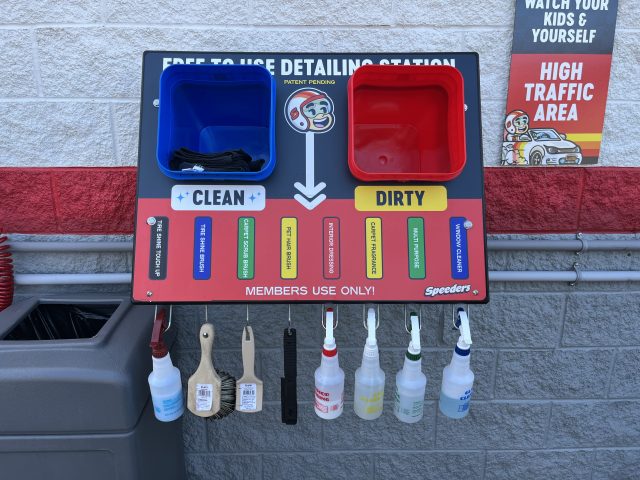 Speeders’ standout feature is its state-of-the-art detailing boards, available to anyone who purchases a wash. Each station has five cleaning products, three specialty brushes, compressed air, tire air pumps, and a dedicated sink for tackling tough, winter-weather grime. The facility also includes a rug beater to handle stubborn mats—just one of many thoughtful touches designed for maximum convenience.