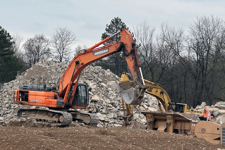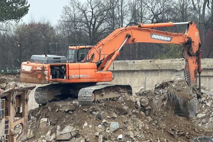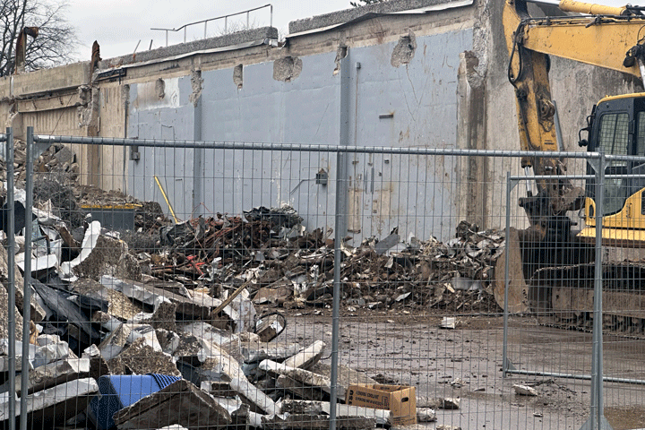 Heavy machinery stands ready as demolition crews clear sections of the former office complex.