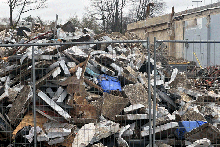 Chunks of concrete, insulation, and other debris are all that remain of the once-bustling corporate headquarters.