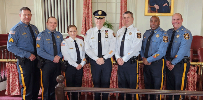 MORRIS COUNTY — Morris County Sheriff James M. Gannon recently presided over a ceremony promoting six Sheriff’s Officers in the Historic Courtroom at the Morris County Courthouse. The ceremony marked a significant and positive impact on the management team of the Morris County Sheriff’s Office Bureau of Law Enforcement. Chief Kelley Zienowicz remarked on how important this day was for the leadership of the Office and how their collective influence will be present for years to come. Sheriff Gannon said how proud and confident he was of all those promoted. He challenged them to seek ways to improve the operations of the Office and thanked family members for their support of the promoted officers. The following received commissions: