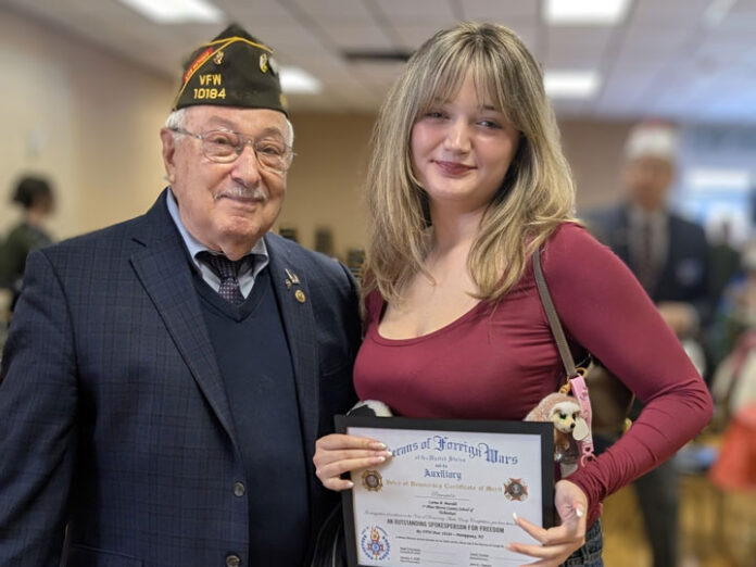 PARSIPPANYย โ- Carina Maroldi, a lifelong Parsippany resident and high school senior in the Multimedia Academy at Morris County School of Technology, has been named the first-place winner of the Voice of Democracy audio-essay competition for VFW Post 10184, representing Parsippany. The award ceremony, held on January 4, 2026, at the Morris Plains VFW, recognized students throughout Morris County for their responses to the national theme: โHow Are You Showing Patriotism and Support for Our Country?โ