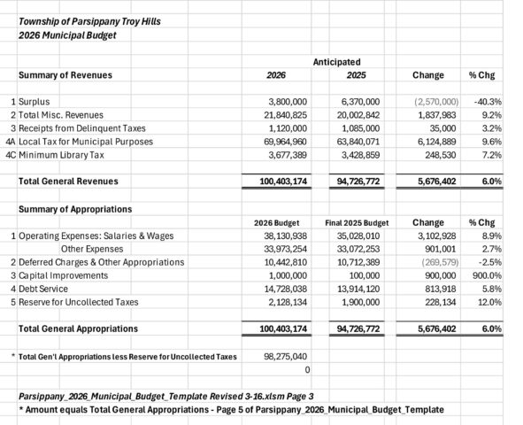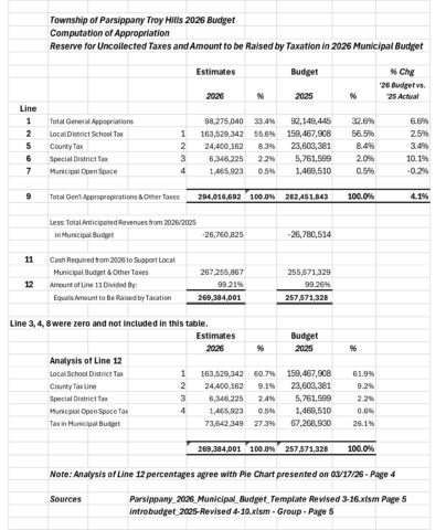 In the January 6 Town Council meeting, the Town Council had a chance to reverse two PILOT (Payment in Lieu of Taxes) projects passed in December. Given recent developments in the budget process, the failure of the Town Council to discuss the reversal of the two PILOT agreements has taken on greater prominence. Based on the Parsippany Focus article of March 20, 2026, on the 1515 Route 10 PILOT, traditional tax collections would be $582,241. However, under the terms of the PILOT agreement, the amount to be collected in 2026 is $296,821.97 per page 16 of the Municipal Budget.