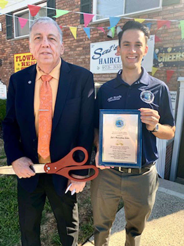 Parsippany-Troy Hills Economic Development Committee Chairman Frank Cahill with Parsippany-Troy Hills Councilman Justin Musella displaying the plaque presented to Sal LeoneParsippany-Troy Hills Economic Development Committee Chairman Frank Cahill presented Sal Leone with a plaque congratulating being in business for fifty years. The plaque read “May the journey of your success continue even in the coming years! Wishing you and your team a happy anniversary!”Sal’s Haircutting Salon is located at 114 North Beverwyck Road, Lake Hiawatha