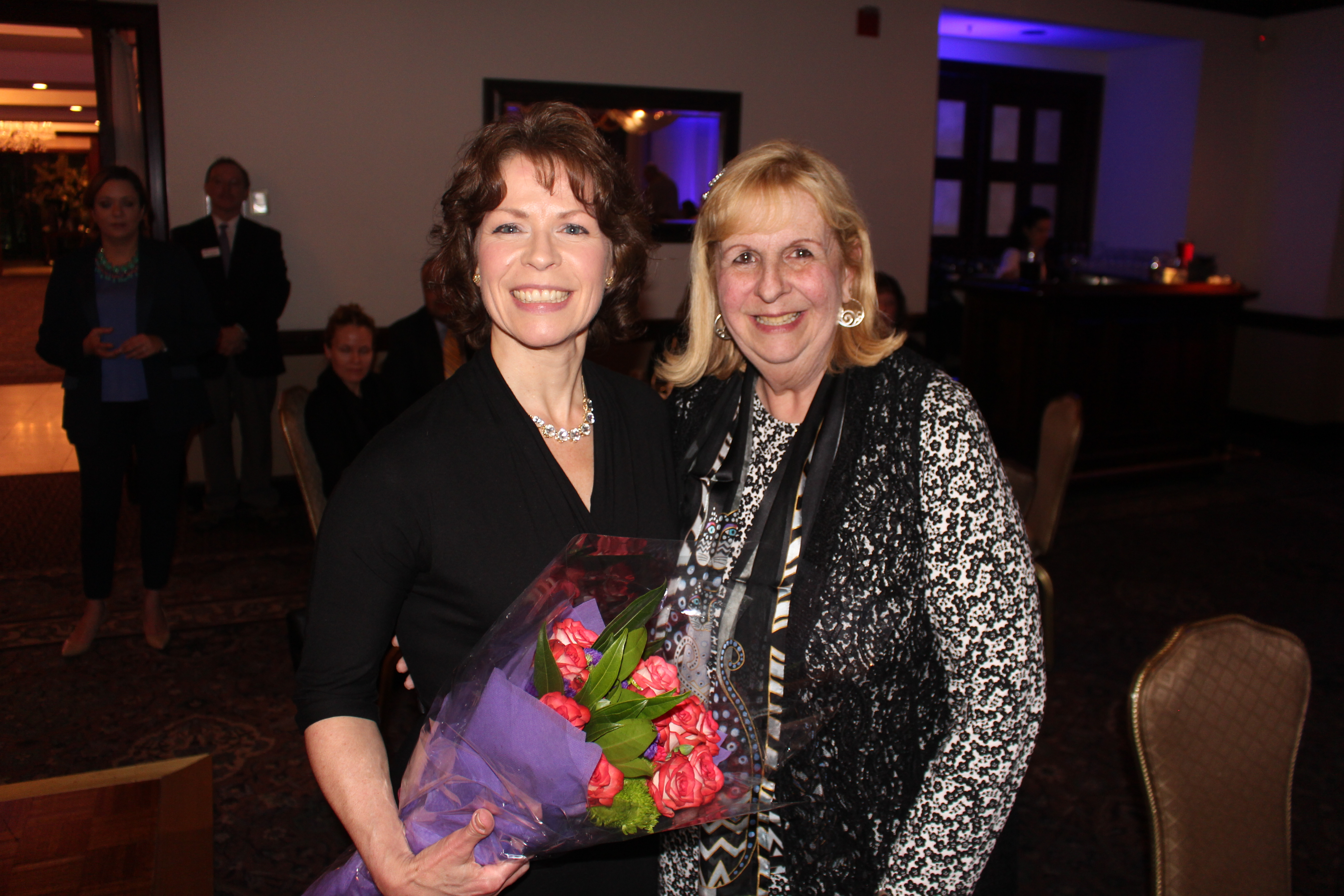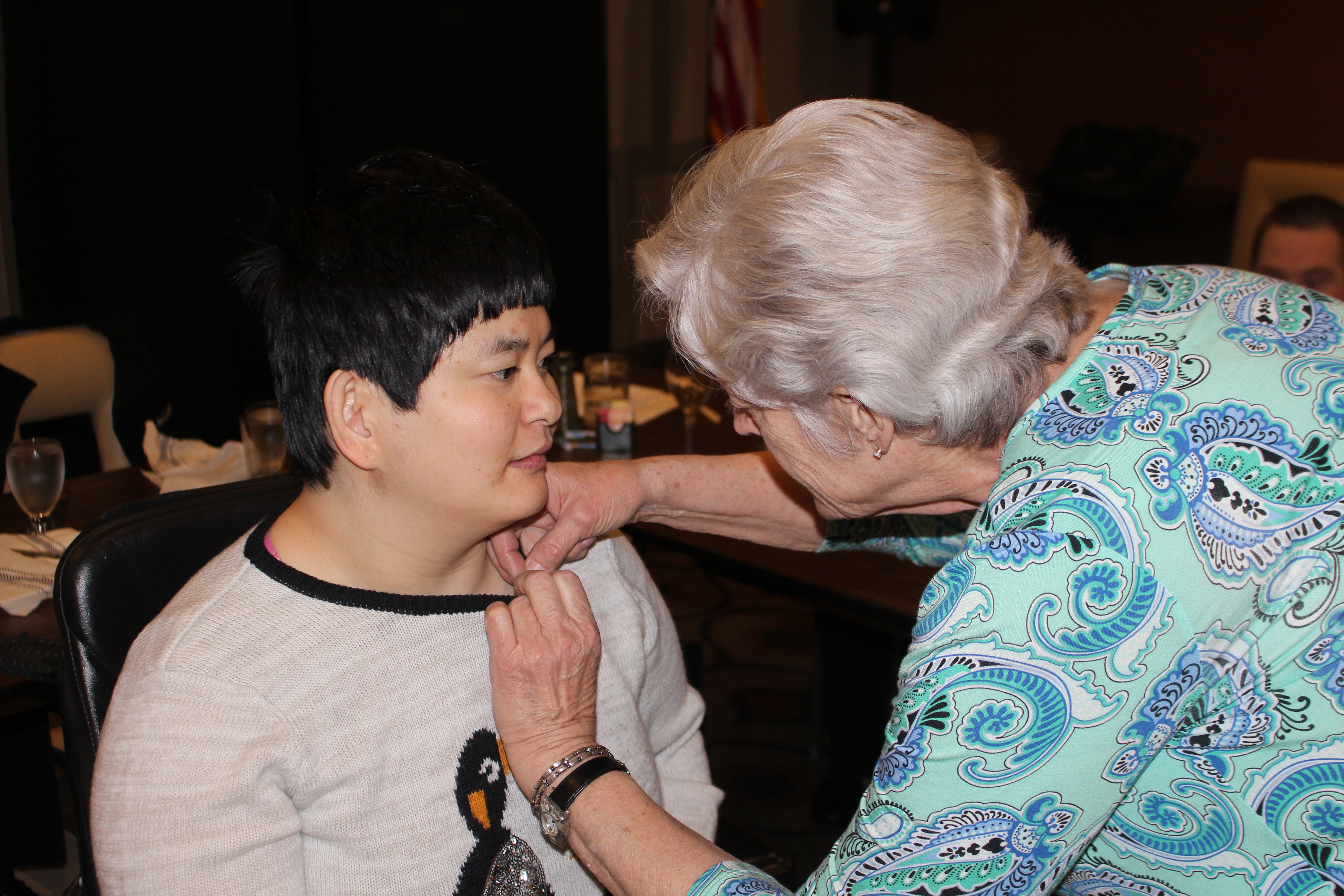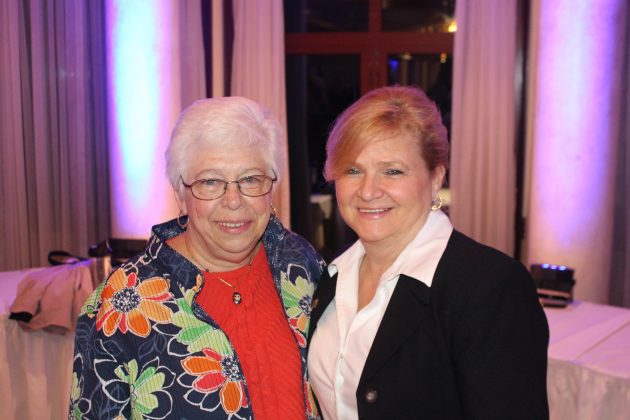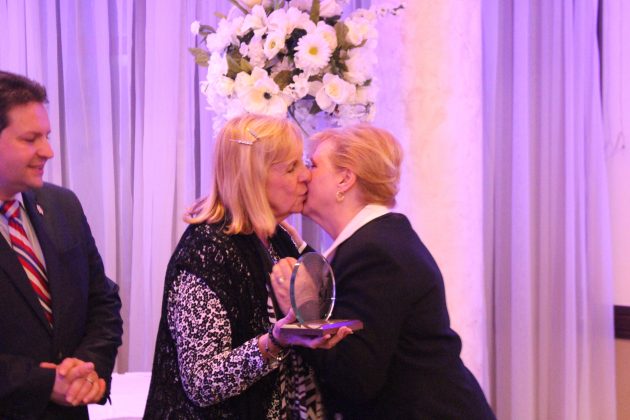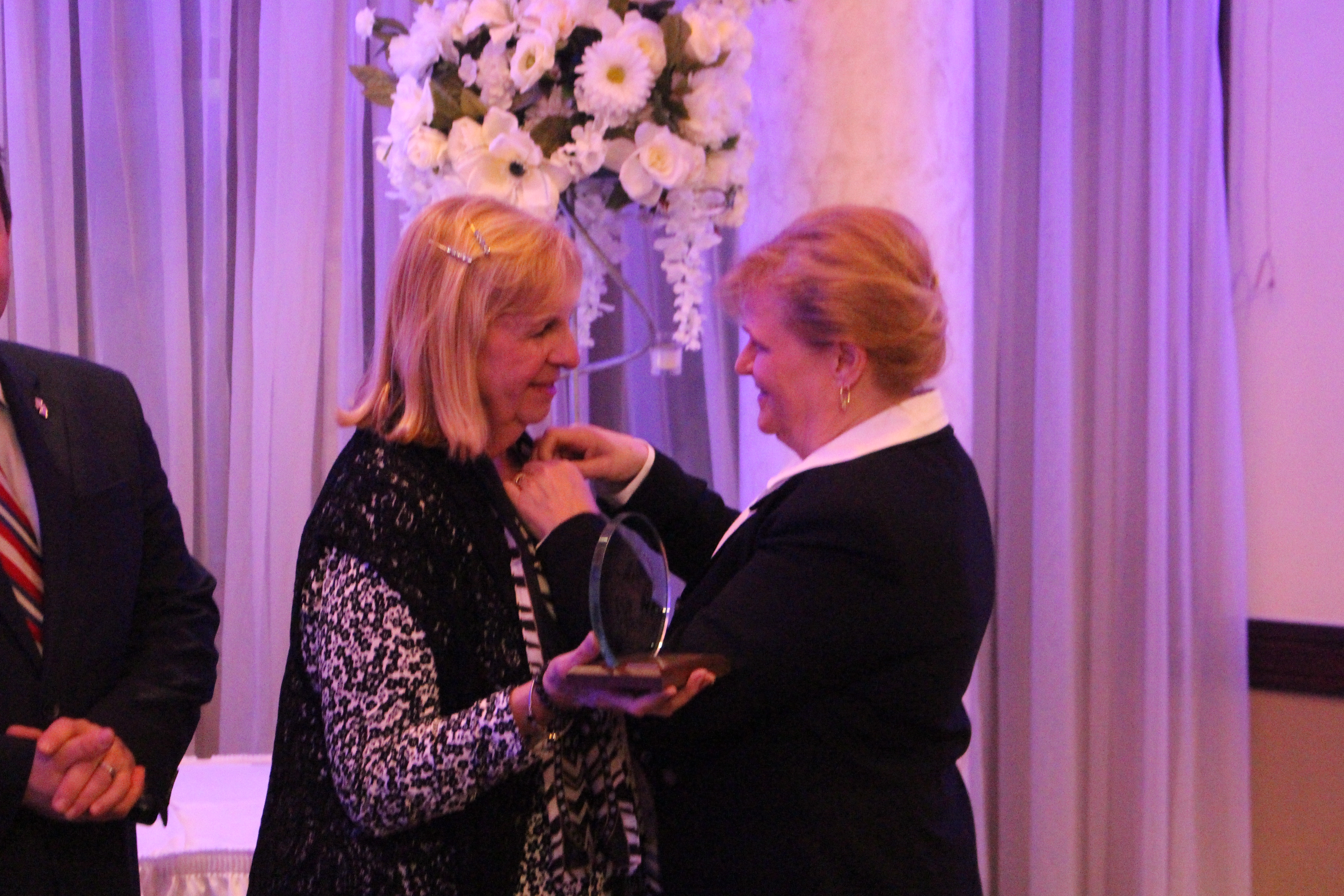 Dinner Co-Chair Karen DeChristopher placing a pin on Carol Tiesi