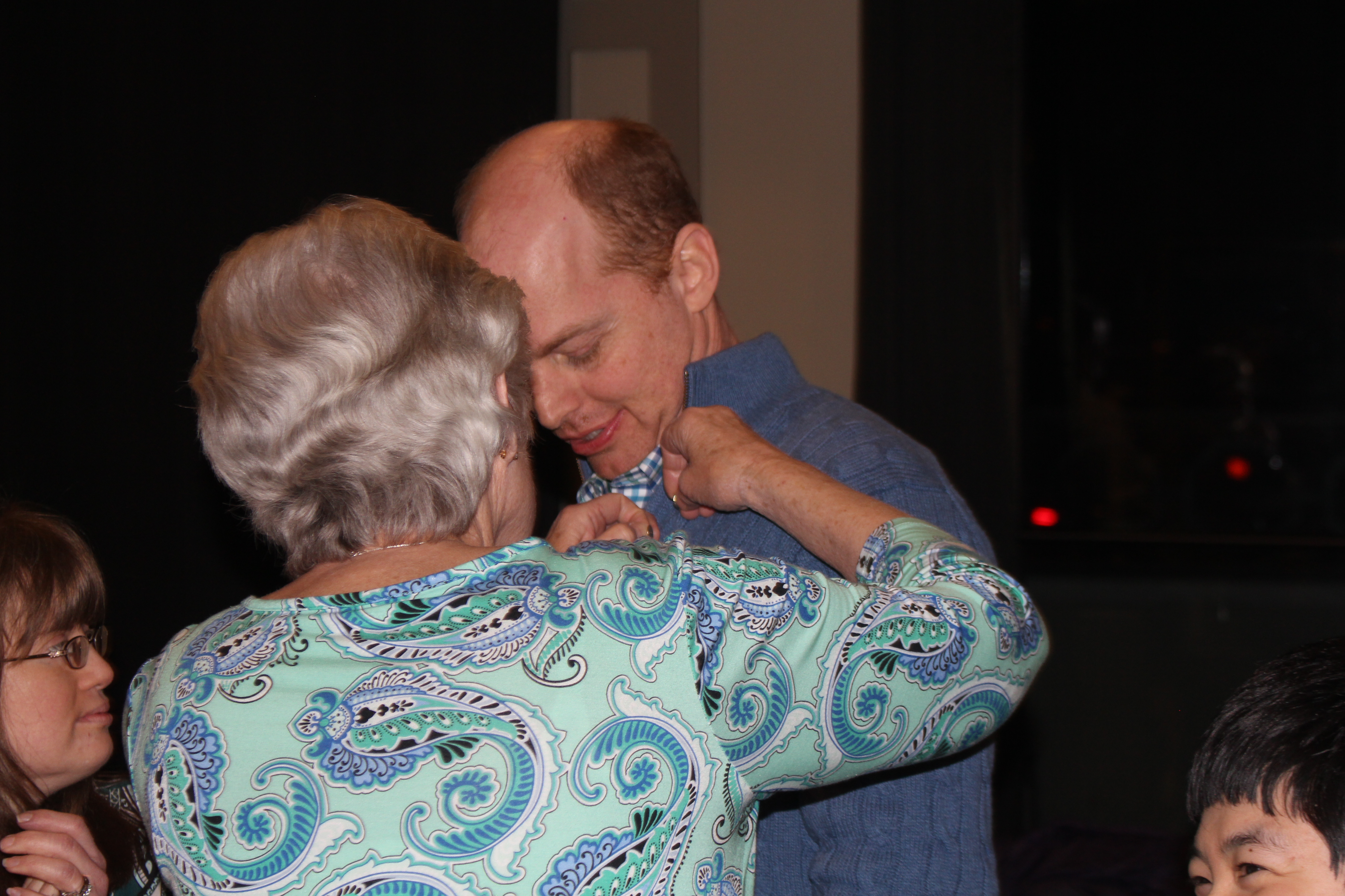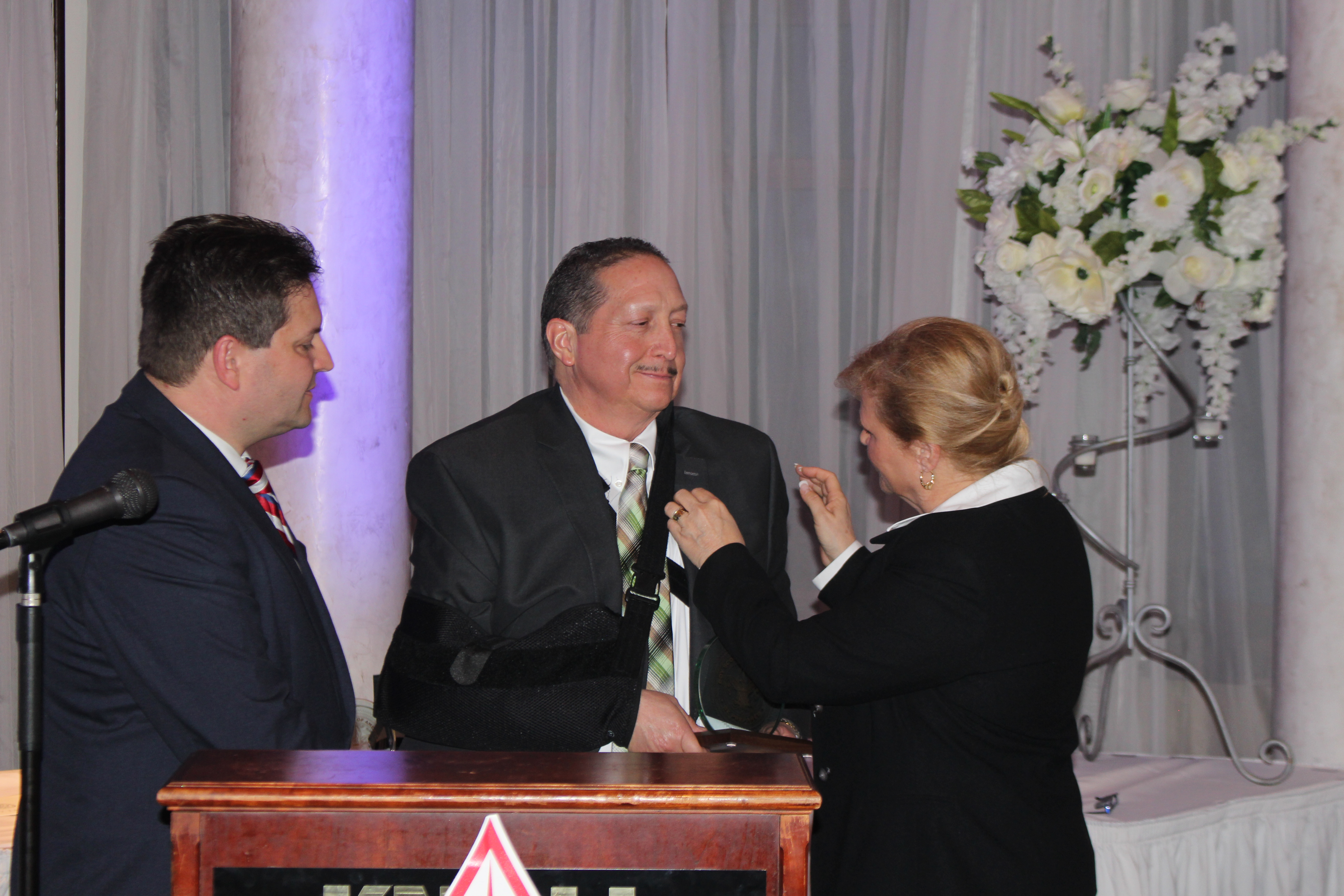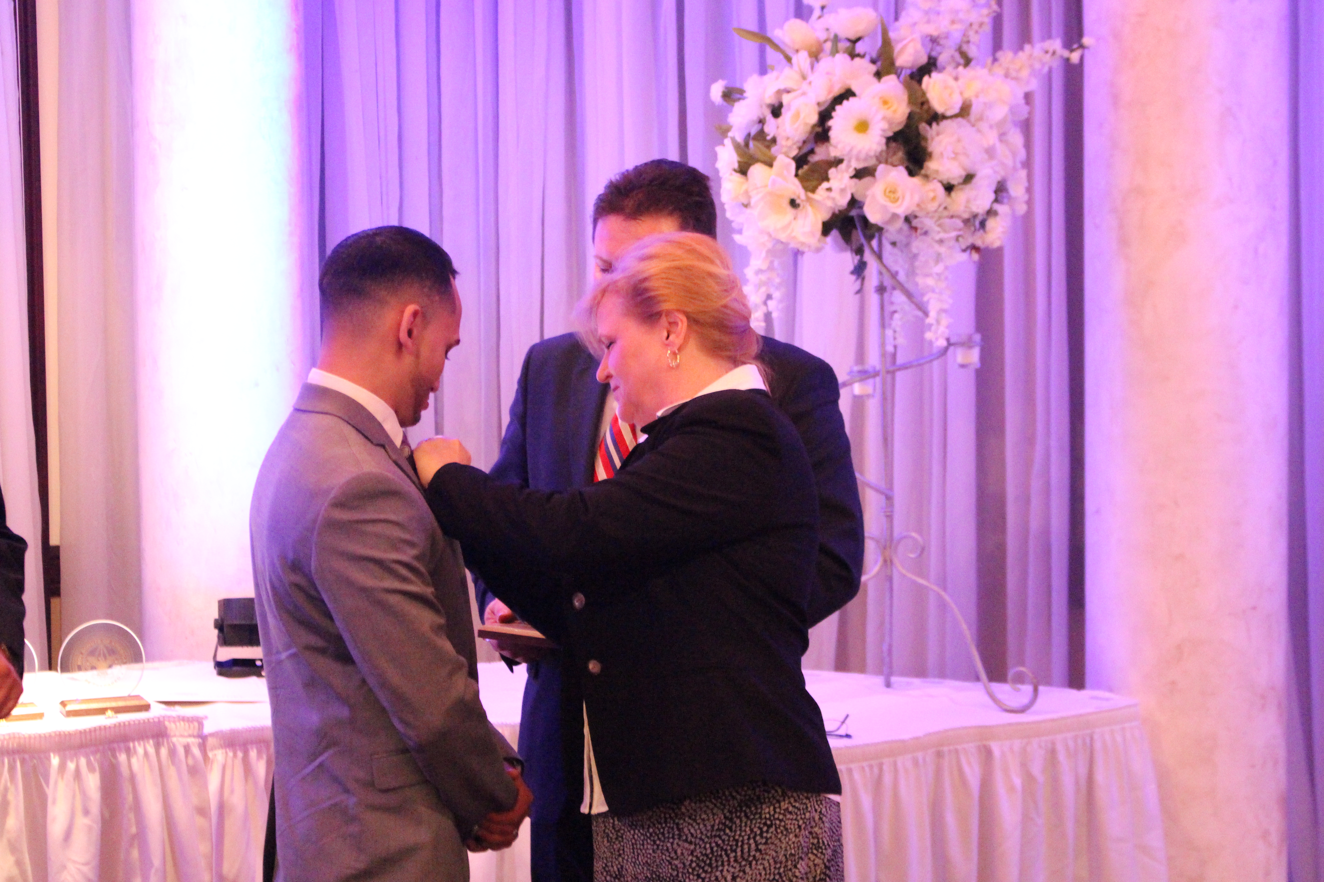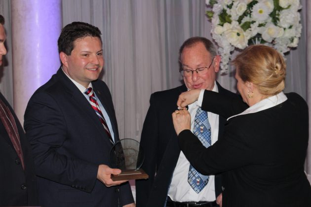 Dinner Co-Chair Karen DeChristopher placing a pin on Al Goldberg, as Co-Chair Robert Peluso watches on